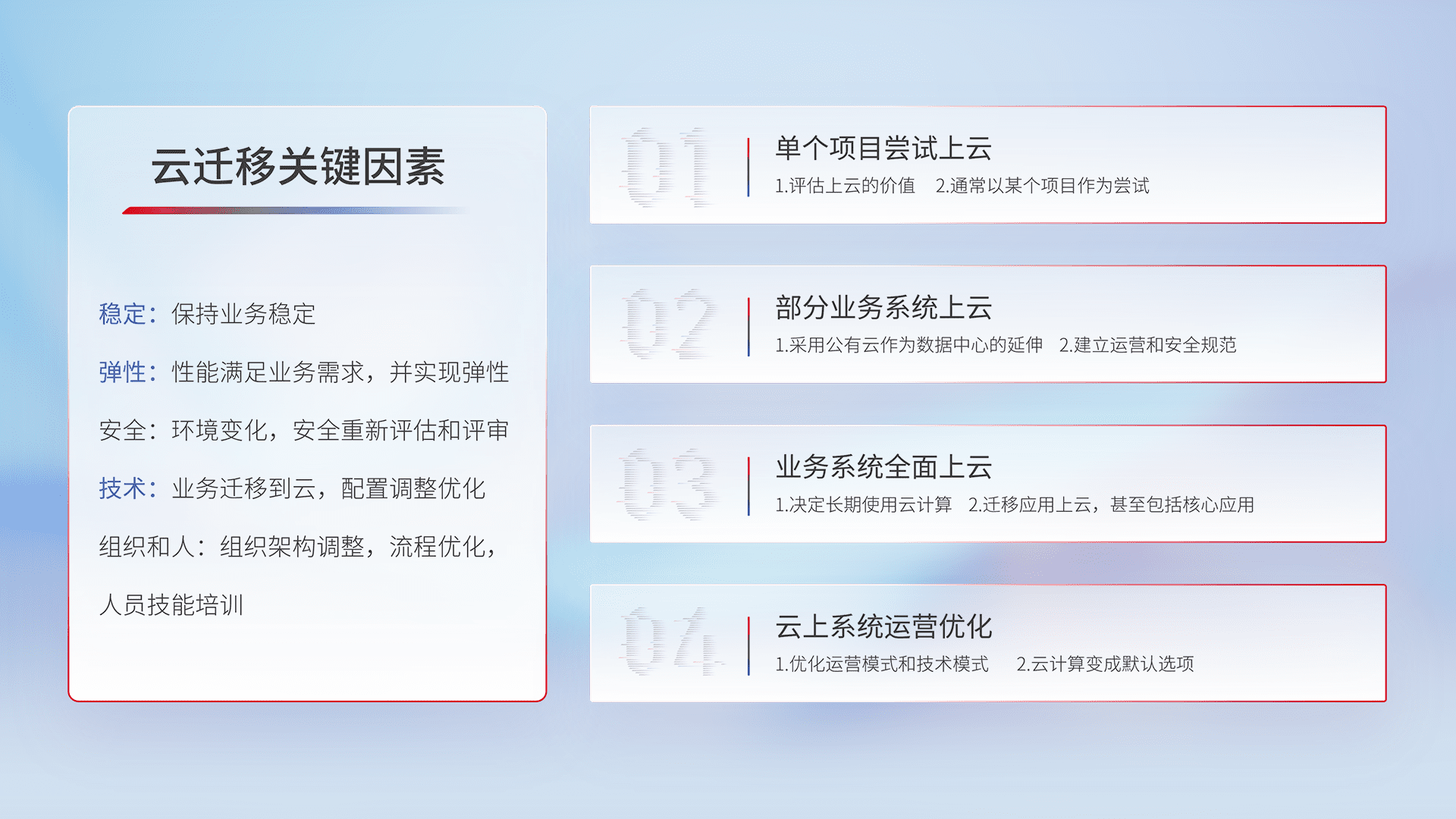 结合实际业务,,,,从规划设计、、、、云平台选型、、云原生改造、、、、数据迁移、、、集成交付,,,,迁移全过程为客户识别最佳上云路径,,做好风险识别管理,,,设计网络架构、、身份权限、、安全审计合规、、操作审计、、、、日志审计、、监控告警策略、、、、多站点容灾设计等,,,,对云上基础设施进行整体规划,,,提升IT治理水平,,以满足弹性、、、高可用、、、高性能的需求。。