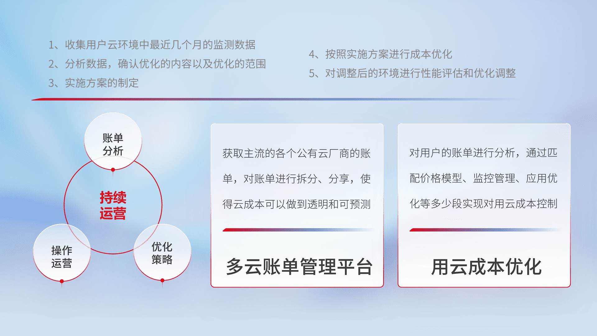 通过多云纳管,,,,以统一的资源数据模型把客户的云资源进行抽象和封装,,,,进而实现对多云资源的统一操作,,保障云资源管理的可靠性、、稳定性与可用性。。量身定制化运维内容,,,配置、、、、开发运维、、、、补丁管理、、、备份、、、、监控、、、认证和访问管理、、审计和日常巡检等,,,,保障在用云过程中的可靠度,,,,稳定度以及高可用率。。